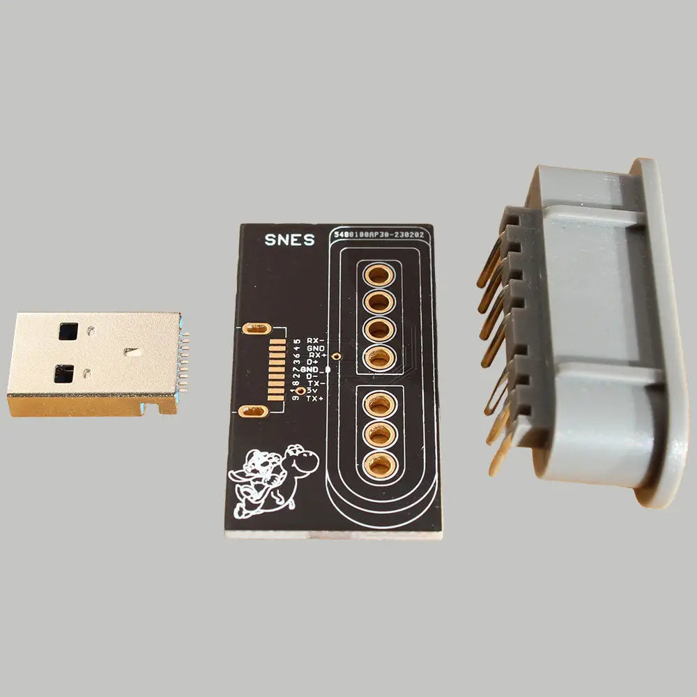 Designed to be used with the MiSTer I/O board (A/V Pro 9.2, Analog I/O 6.1 or Digital I/O 1.2), the SNAC adapter provides a seamless and lag-free connection for the end user. When paired with supported cores on the MiSTer, this adapter allows Super Nintendo controllers to be used effectively. Each kit contains a USB 3.0 connector and a 90° SNES connector to provide flexibility and convenience in setup.